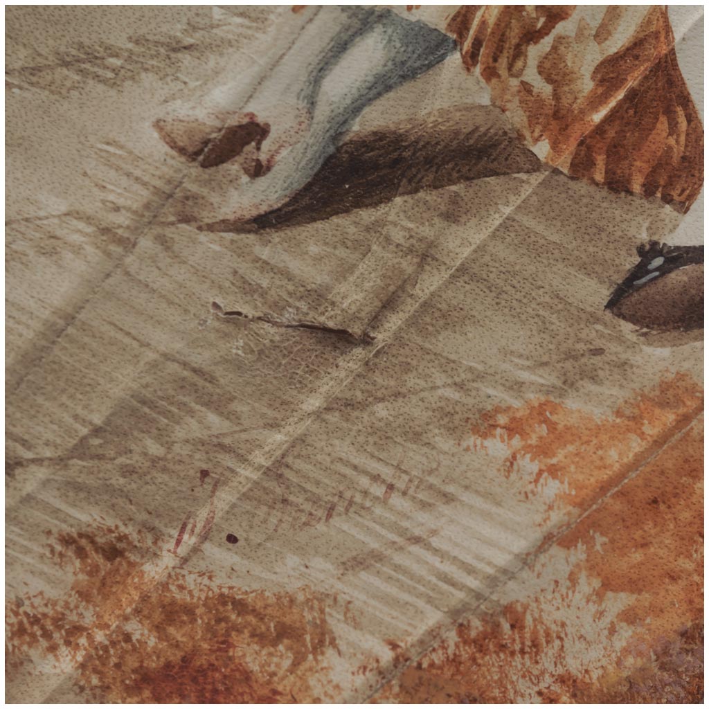 Varillaje de madreperla detallado al oro, y país de papel pintado en acuarela. Firmado: "J. Sánchez".