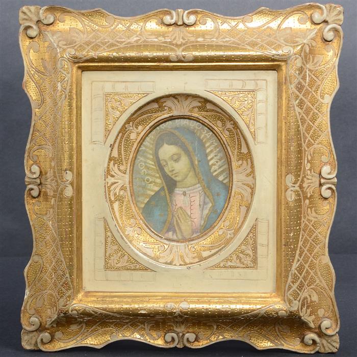 c) Impresión de virgen de Guadalupe. Enmarcada en madera tallada.