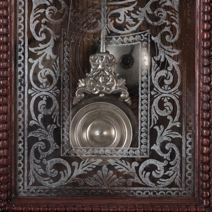 Mecanismo de péndulo y llave, carátula blanca, índices arábigos y manecillas tipo espada.