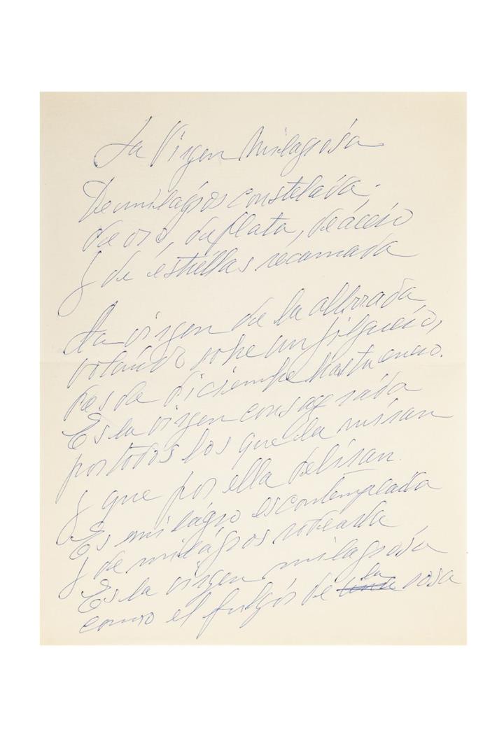 Subasta 925, Lote # 238 DA - Amor, Guadalupe. Poemas / Escritos. a) Mis Crímenes. México: Federación Editorial Mexicana, 1986. 4o. marquilla, 15 h. Edición de 100 ejemplares, ejemplar número 68. Firmado y dedicado por la autora. Ilustraciones de Ramón Sánchez Lira. Encuadernado en rústica. b) Escritos dirigidos a Josefína Tamayo. 6 h. 28 x 21.5 cm. 5 hojas impresas, una manuscrita. Engrapadas. c) 'La Virgen milagrosa de milagros constelada de oro, de plata, de acero y de estrellas...'. 1 h. 28 x 21.5 cm. Manuscrita. c) Las Nueve Musas. 2 h. 21 x 13.5 cm. a: Miriam Schoenfeld. d) Mi Lecho Turbulento. 20 h. 13.5 x 10.5 cm. Firmado y dedicado por la autora. Engrapado, pasta dura. e) Guadalupe Amor. 19 p. 20 x 13.5 cm. Firmado y dedicado por la autora. Engrapado, pasta en rústica. f) Los Cielos / Las Olas / Manuel Sánchez Santoveña. 3 h. Diferentes formatos. Piezas: 3. Total de piezas: 9. Estimado $8,000-10,000