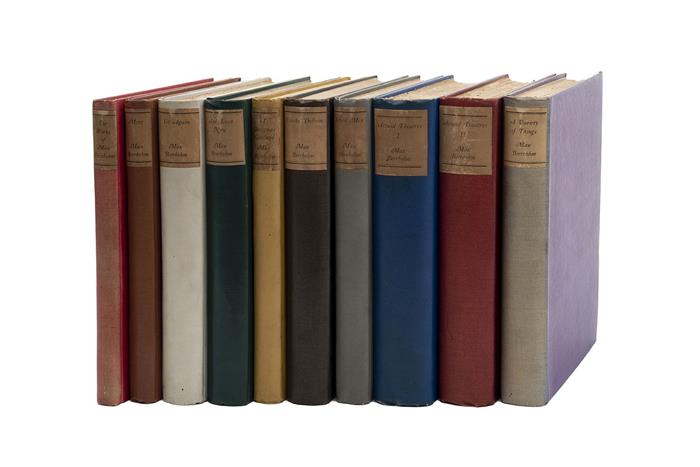 4o. marquilla, 138; 180; 322; 308; 176; 336; 219; 524; 492; 353 p. Edición de 780 ejemplares, ejemplares número 126. Obras: The Works of Max Beerbohm, More, Yet Again, And Even Now, A Christmas Garland, Zuleika Dobson, Seven Men, Around Theatres y A Variety of Things, en 10 tomos. Primer tomo firmado por Max Beerbohm y Dyneley Hussey. Encuadernados en pasta dura. Piezas: 10.