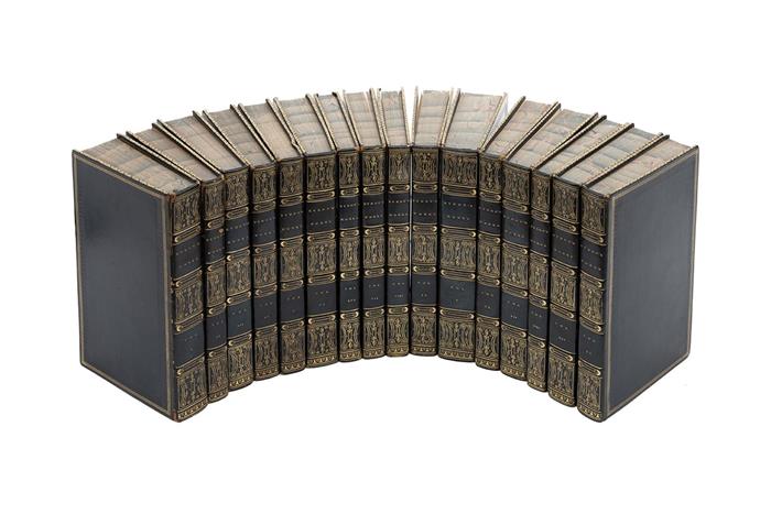 8o. marquilla, 264; 201; 293; 268; 272; 321; 225; 215; 271; 402; 247; 306; 206; 329; 287; 204 p. Tomos I - XVI. Ex Libris de Sir Archibald Hamilton Dunbar. Tomo I: Facsímil de carta de Lord Byron. Tomo II: página 201 rasgada, afecta poco texto. Encuadernados en pasta dura, en piel. Piezas: 16.