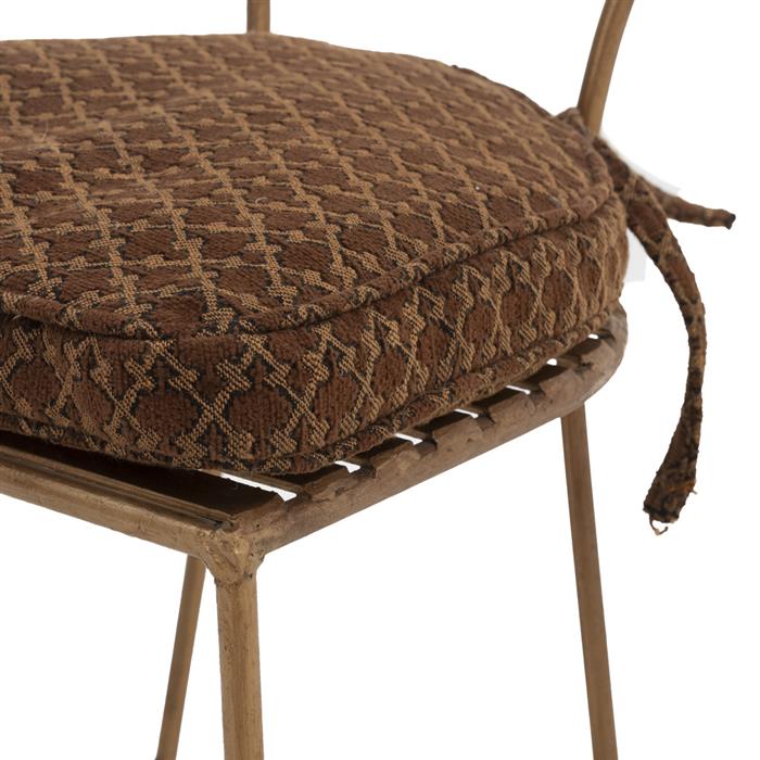 Con respaldo a manera de reloj, asiento con cojín en tapicería color marrón, fustes lisos, chambrana en "X" y soportes circulares.