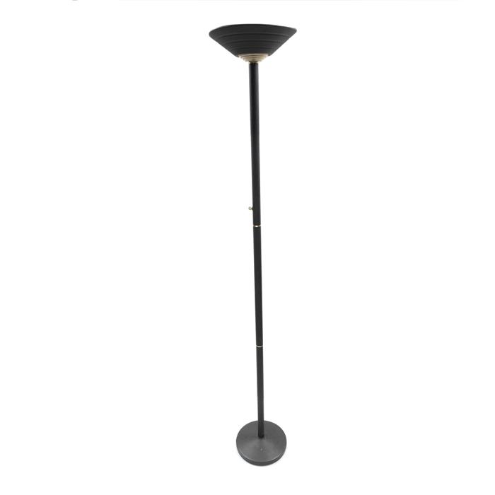 Fuste liso de metal laqueado, pantalla cónica de metal con acrílico y base circular.