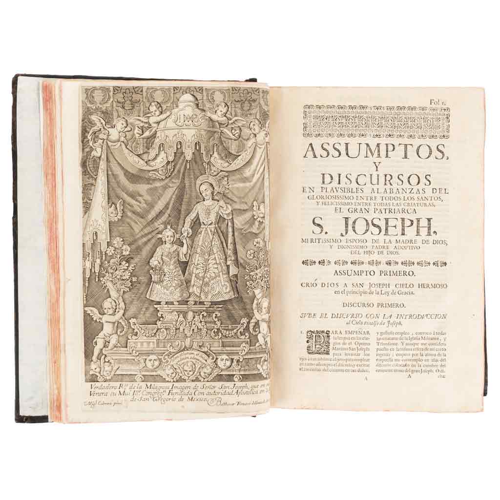 Subasta 961, Lote # 235 Torres, Pedro de. Excelencias de S. Joseph, Varón Divino, Patriarca Grande, Esposo Pvrissimo de la Madre de Dios, y Altissimo Padre Adoptivo del Hijo de Dios. Sevilla: Por los Herederos de Thomas López de Haro, 1710. 4o. marquilla, 22 h. + 1208 p. + 33 h. Que en método panegyrico ilustra el P. Pedro de Torres, de la Compañía de Jesús, natural del Reyno de Chile, en las Indias Occidentales. Y consagra, en el Cielo a la Seráfica Madre Santa Teresa de Jesús Doctora Mystica de la Iglesia, y Fundadora de la Ilustre Religión de Carmelitas Descalzos. Y dedica en la Tierra a la Ilustrisima Señora Da. Juana de Urdanegui Luxan y Recalde, Presidenta y Governadora del Reyno de Chile. Un grabado: "Verdadero Rto. de la Milagrosa Imagen de Señor San Joseph, que en su Capilla Venera su mui Ille. Congregn. Fundada con Autoridad Apostólica en la Iglesia de San Gregorio de México", Miguel Cabrera pinxi. - Balthasar Troncoso delineavit et Sc. ao. de 1743. Errores de paginación: páginas 91 - 94, dicen 101 - 104; no hay página 765 - 766. Últimas 8 hojas, muy manchadas. Encuadernado en pasta dura, en piel. Estimado $18,000-22,000