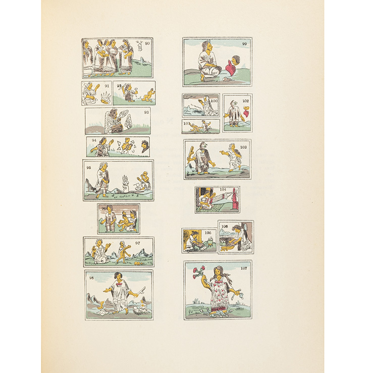 Subasta 986, Lote # 181 Sahagún, Bernardino. Historia General de las Cosas de la Nueva España. México: Editorial Pedro Robredo, 1938. 4o., LXXXIV + 396; 418; 390; 446; 339 p. Tomos I - V. Tomo I: Retrato del autor, cuatro láminas y dos tablas plegadas. Tomo II: Cinco láminas. Tomo III: Cinco láminas. Tomo IV: Cinco láminas. Tomo V: Cuatro láminas. Lomos con costillas, hierros dorados y tejuelos. Encuadernados en pasta dura, en piel. Piezas: 5. Palau: 285000. Obra escrita por el religioso franciscano español Bernardino de Sahagún entre los años de 1540 y 1585. Se le denomina también Códice Florentino, ya que el manuscrito original se encuentra resguardado en la Biblioteca Medicea Laurenciana de Florencia, Italia. En su obra, Sahagún pretendió reunir información sobre la historia y cultura de los pueblos indígenas del altiplano central de México, con la finalidad de facilitar la labor evangelizadora de los misioneros españoles. Estimado $7,000-9,000