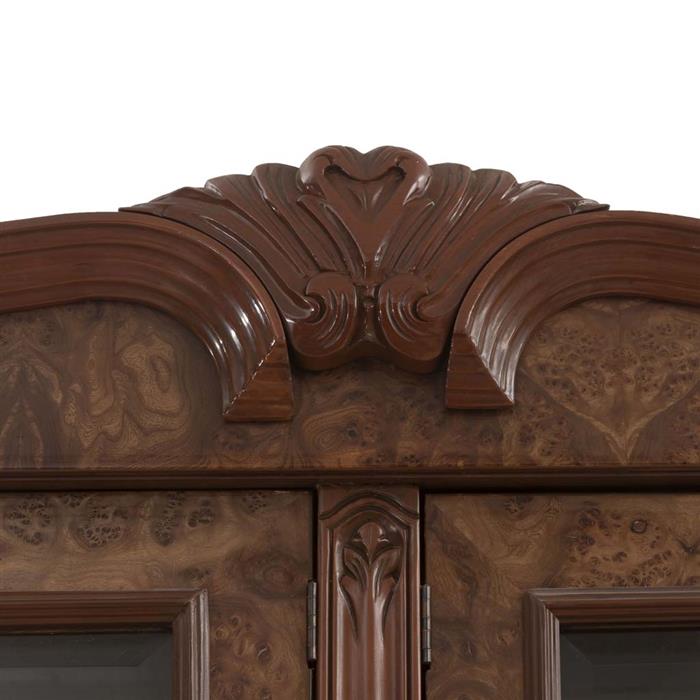 c) Vitrina. A 2 cuerpos. Con 8 puertas abatibles, 4 con cristal biselado, 4 cajones, tiradores de metal dorado y soporte tipo zócalo. Decorada con elementos orgánicos y molduras.