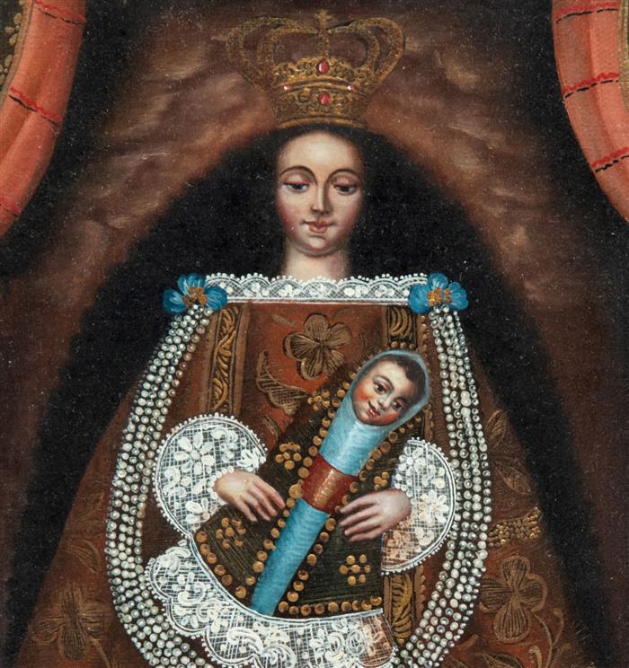 b) ANÓNIMO. Virgen con niño. Óleo sobre tela. 28 x 19 cm.