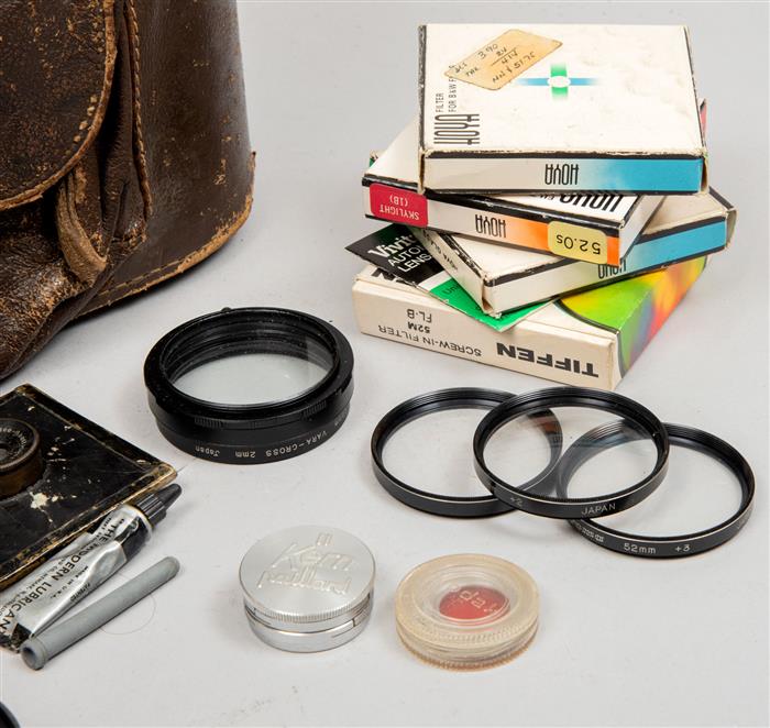 Consta de: lente 1:63 f=50mm, Minicel (micro-trigger), soporte para filtro y 16 filtros, algunos de color anarajado y azul.