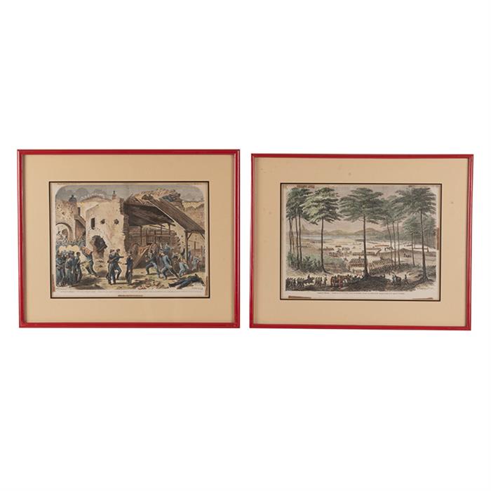 Subasta 1051, Lote # 103 Castro, Casimiro / Le Monde Illustré. Miramar / Colección de Grabados de la Intervención Francesa. a) Castro, Casimiro - Decaen. Miramar. Litografía, 24 x 33.7 cm. Lito. de Decaen - C. Castro y G. Ródriguez Lito. Recortada en márgenes. Enmarcada. b) Le Monde Illustré. Colección de Grabados de la Intervención Francesa. París, 1862 - 1867. Grabados tomados del periódico "Le Monde Illustré", varios tamaños (5 coloreados). Títulos: "Le General Bazaine", "Combat de Cerro de Leone", "Opérations du Siége de Puebla", "Le Général Forey, a son Quartier Général du Cerro de San Juan", "Départ du Général Forey pour Quecholac", "Entrée du Maréchal Forey" y "Le Général Bazaine Occupe la Ville de Mexico". Enmarcados. Piezas: 6. Total de piezas: 7. Estimado $3,000-4,000