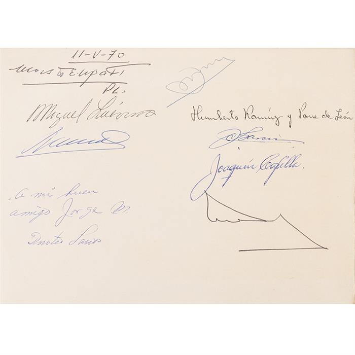Fotografía, 12.8 x 17.9 cm. Retrato firmado por 9 individuos: Miguel Luévano, Humberto Ramírez Ponce de León, Doroteo Lasso y destaca, entre ellos, Joaquín Capilla, máximo medallista olímpico mexicano, entre otros. Al reverso marca de la fonda Santa Anita.