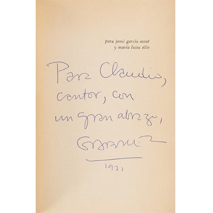 Subasta 1051, Lote # 72 "A Claudia, para que aprenda que 2 + 2 no son 4". Colección de Obras de Gabriel García Márquez, dedicados por él. a) Cien Años de Soledad. Buenos Aires: Editorial Sudamericana, 1969. 8o. marquilla, 351 p. Décimotercera edición. Página 297-298 rasgada. Encuadernado en rústica. b) Isabel Viendo Llover en Macondo. Buenos Aires: Editorial Estuario, 1969. 8o. marquilla, 43 p. + 2 h. Pastas desprendidas. Encuadernado en rústica. c) El Coronel No Tiene Quien le Escriba. Buenos Aires: Editorial Sudamericana, 1970. 8o. marquilla, 91 p. + 1 h. Colección Índice. Encuadernado en rústica. d) La Hojarasca. Buenos Aires: Editorial Sudamericana, 1970. 8o. marquilla, 133 p. + 1 h. Colección Índice. Encuadernado en rústica. e) La Mala Hora. Buenos Aires: Editorial Sudamericana, 1970. 8o. marquilla, 203 p. + 2 h. Colección Índice. Encuadernado en rústica. f) Los Funerales de La Mamá Grande. Buenos Aires: Editorial Sudamericana, 1970. 8o. marquilla, 147 p. + 2 h. Colección Índice. Encuadernado en rústica. g) Relato de un Náufrago que estuvo diez días a la deriva en una balsa sin comer ni beber... Barcelona: Tusquets Editor, 1970. 8o. marquilla, 88 p. + 1 h. Cuadernos marginales 8. Encuadernadpo en rústica. Total de piezas: 7. Estimado $12,000-14,000