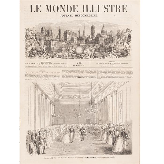Paris: Imp. de la Librairie Nouvelle - Imprimiere Vallée, 1857 y 1863 - 1864. Números sueltos, Primeras Planas y hojas sueltas. En las que se ilustran "Mariage de LL. AA. I. et R. l'archiduc Maximilien et la princesse Charlote…", "Arrive a Bruxelles de S. A. I. l'archiduc Maximilien" de 1857, y vistas de ciudades, paisajes, batallas, avance del ejército francés y su entrada a la Ciudad de México, y escenas costumbristas del pueblo de México (1863 - 1864).
