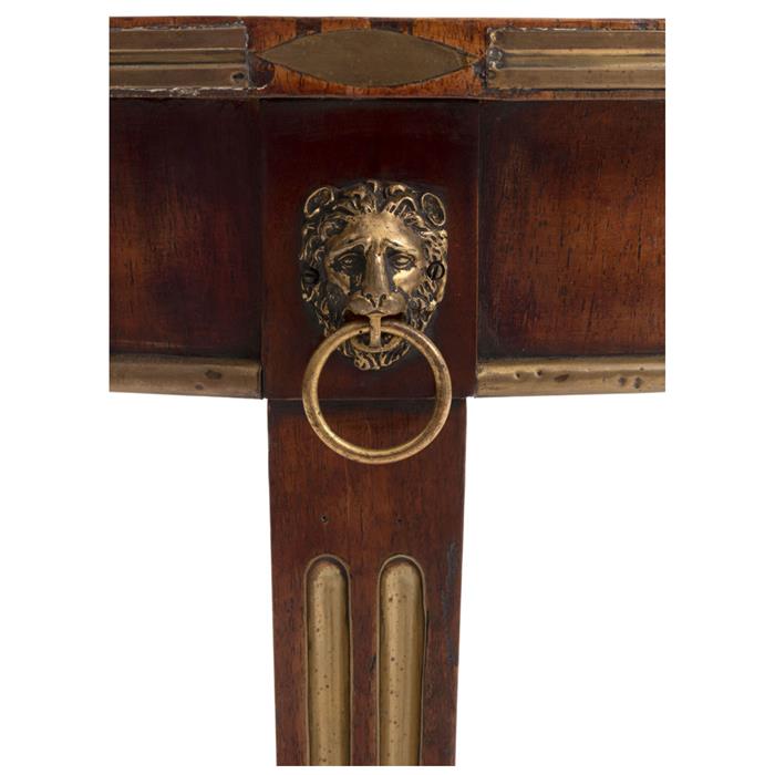 Elaborada en madera con aplicaciones de bronce dorado a manera de garra, cabezas de león y barandilla. Cuenta con dos niveles.