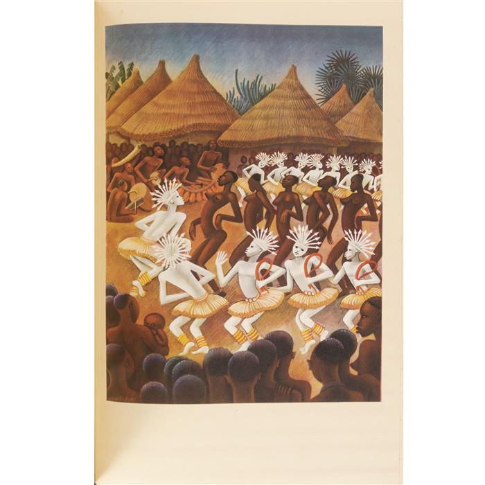 Subasta 1128T, Lote # 113 Maran, René. Batouala. New York: The Limited Editions Club, 1932. XIV + 117 p. + 1 h. Ilustraciones intercaladas en el texto, y seis láminas a color. A novel, translated by Alvah C. Bssie and Illustrated by Miguel Covarrubias. Colofón: "Fifteen hundred copies of this edition... the illustrations by Miguel Covarrubias, who here signs the copy... This copy is number C. P. R.". Firmado por Miguel Covarrubias. Sin refinar. Lomo deteriorado, con faltantes. Encuadernado en pasta dura, en piel. Estimado $3,000-4,000
