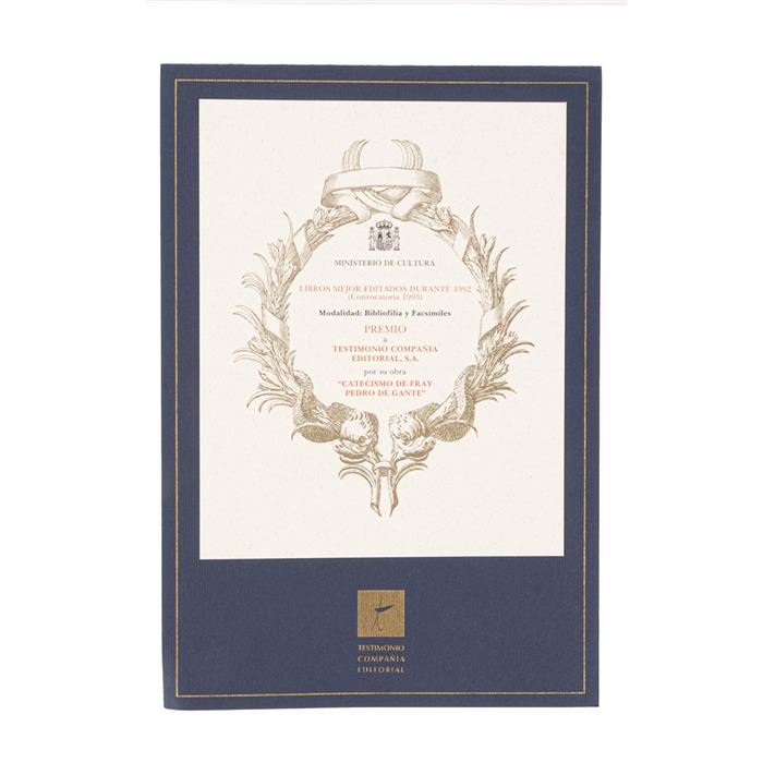 Subasta 1077, Lote # 128 Catecismo de Fray Pedro de Gante. Madrid: Testimonio, Compañía Editorial, Quinto Centenario, 1992. Texto: 4o., 144 p. Encuadernado en pasta dura. Facsimilar. "Certifica: que de la obra… cuyos originales se encuentran en el ARCHIVO GENERAL DE SIMANCAS, se ha hecho una edición facsímil de 980 ejemplares, numerados del 1 al 980, con destino al mercado nacional e internacional en coedición con el Ministerio de cultura, Quinto Centenario, Testimonio Compañía Editorial correspondiéndole al presente ejemplar el número 389". En estuche. Estimado $8,000-10,000