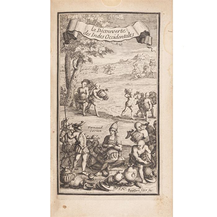 8o., frontispicio + 4 h. + 382 p. + 1 h. Frontispicio, representa a Hernán Cortés y Moctezuma y una viñeta por P. Giffart. Lomo con pequeño faltante. Encuadernado en pasta dura, en piel.