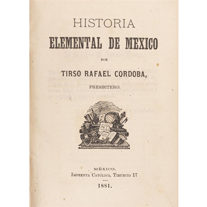 Subasta 1081, Lote # 60 Payno, Manuel / Córdoba, Tirso Rafael. Compendio de la Historia de México / Historia Elemental de México. a) Payno, Manuel. Compendio de la Historia de México. México: Imprenta de F. Díaz de León, 1880. 16o. marquilla, 408 p. Sexta edición. Para el uso en los Establecimientos de Instrucción Pública. Corregida y notablemente aumentada con los catálogos de los reyes indígenas y los sucesos acaecidos hasta 1880. Algunas notas y subrayados en texto. Encuadernado en pasta dura. b) Córdoba, Tirso Rafael. Historia Elemental de México. México: Imprenta Católica, 1881. 16o. marquilla, 476 + 14 p. Conserva pasta original en rústica. Encuadernado en pasta dura, lomo en piel. Total de piezas: 2. Estimado $3,000-4,000