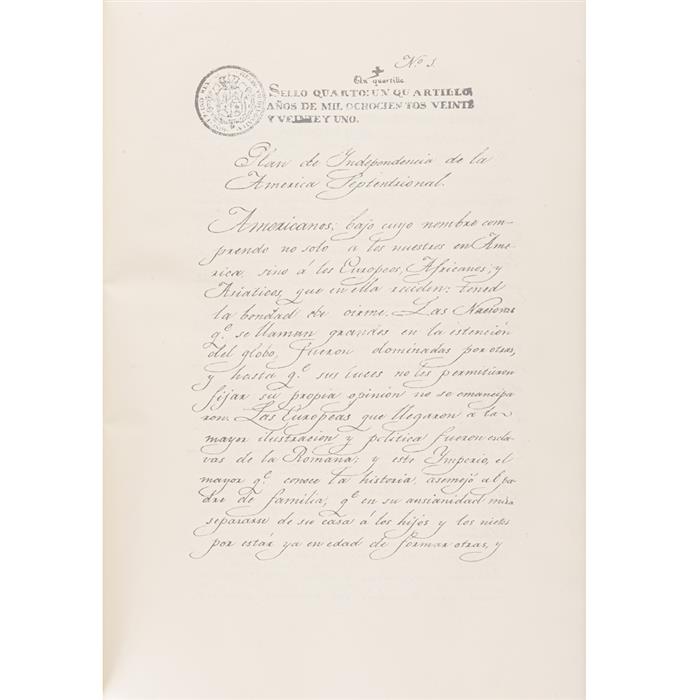 Subasta 1081, Lote # 36 Iturbide, Agustín de. Plan de Independencia de la América Septentrional. Yguala 24 de Febrero de 1821. México: Documentos del Centro de Estudios de Historia de México, Fundación Cultural de "Condumex", 1968. fo. marquilla, 8 h. Facsimilar. "Consta esta edición facsimilar del "Plan de Iguala" de un ejemplar impreso en papel de la época, destinado al C. PRESIDENTE DE LA REPÚBLICA, LICENCIADO GUSTAVO DÍAZ ORDAZ y de DIECINUEVE ejemplares impresos en papel Fairfield Wedding de 50.8 Kilogramos, destinados: TRES DE MÉXICO, DOCE, a los miembros de su consejo consultivo y CUATRO para obsequio a los invitados de honor a la IVa.Reunión de dicho consejo…". Encuadernado en pasta dura, en piel. En carpeta, grabada con el nombre de Antonio Carrillo Flores, Secretario de Relaciones Exteriores (1964-1970). Al término de la lucha por la Independencia de México, Iturbide y otros caudillos independentistas, se dedicaron a organizar la estructura política del nuevo gobierno mexicano, para lograrlo convocaron a un Congreso Constituyente. España no había aceptado los Tratados de Córdoba, Veracruz, y siendo éstos una extensión del Plan de Iguala, también éste quedó anulado, lo que desembocó en la coronación de Iturbide como Emperador Constitucional. Estimado $7,000-9,000