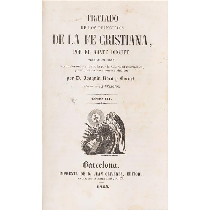 Subasta 1081, Lote # 393 Colección de Obras Sobre Religión Católica. a) Sermones Familiares, Compuestos por San Francisco de Sales, Obispo, y Príncipe de Geneva. Madrid: Andrés Ortega - En la Imprenta de la Viudad de Manuel Fernández, 1770 8o. marquilla, 7 h. + 344 p.; 7 h. + 386 p. Tomos I - II. Traducidos del idioma francés al español por Don Florián de Anisón. Tomo II: Página 37 sin punta inferior. Ex libris de Guadalupe Gorraez de Cosío. Pastas y lomo gastado; textos con manchas de humedad, afectan poco texto. Encuadernados en pasta dura, en piel. Piezas: 2. b) Señeri, Pablo. Maná del Alma, o Exercicio Fácil y Provechoso para Quien Desea Darse de Algún Modo a la Oración. Madrid: Don Antonio de Sancha, 1784. 8o. marquilla, 306 p. Portada por desprenderse. Pastas y lomo gastados, con faltantes. Encuadernado en pasta dura, en piel. c) Duguet, Jacques Joseph. Tratado de los Principios de la Fe Cristiana. Barcelona: Imprenta de D. Juan Oliveres, editor, 1845. 8o., 303; 305; 346 p. + 4 h. Traducción libre, escrupulosamente revisada por la Autoridad eclesiástica y enriquecida con algunos apéndices por D. Joaquín Roca y Cornet. Encuadernados en pasta dura, en piel. Piezas: 3. d) Oficio de la Semana Santa. Madrid: Don Antonio de Sancha, 1784. 16o. marquilla, 491 p. Traducido al castellano por Joaquín Lorenzo. Segunda impresión ilustrada con notas. Se ha añadido al fin para uso de los fieles la liturgia u ordinario de la misa, y el symbolo de San Atanasio en lengua vulgar. Ex libris del Mariscal de Castilla Marqués de Ciria. Encuadernado en pasta dura, en piel. e) Croiset, Jean. Retiro Espiritual para un Día cada Mes Mui Útil para la Reforma de las Costumbres, y para Disponerse con Santa Vida para una Buena Muerte. Sevilla: Impreso en las Siete Revueltas, sin año. 16o. marquilla, 3 h. + 399 p. + 3 h. Lomo rasgado. Encuadernado en pasta dura, lomo en piel. f) San Juan Bautista, Cayetano de. Explicación de la Doctrina Christiana, Según el Método con que la Enseñan los Padres de las Escuelas Pías a los Niños que Freqüentan sus Escuelas. México: Reimpresa en la Imprenta de D. Mariano de Zúñiga y Ontiveros, 1807. 16o. marquilla, 332 p. Algunas páginas refinadas en margen externo. Pastas y lomo gastados. Encuadernado en pasta dura, en piel. g) Romero, Francisco. Devocionario Sagrado de los Privilegios, Gracias y Glorias del Padre Putativo de Jesús y Esposo de María, el SSmo. Patriarca Señor San José, Compatrono de Cádiz. París: Librería de Rosa, Cité - Bergère, 1830. 16o. marquilla, 208 p. Ex libris de Guadalupe Gorraez de Cosío y de Manuela Cosío. Pastas y lomo gastados, lomo rasgado. Encuadernado en pasta dura, en piel. Total de piezas: 10. Estimado $4,000-6,000