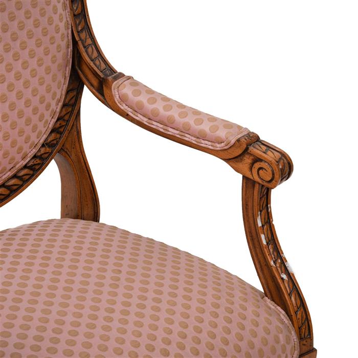 Elaborado en madera. Con tapicería de tela en color rosa y dorado