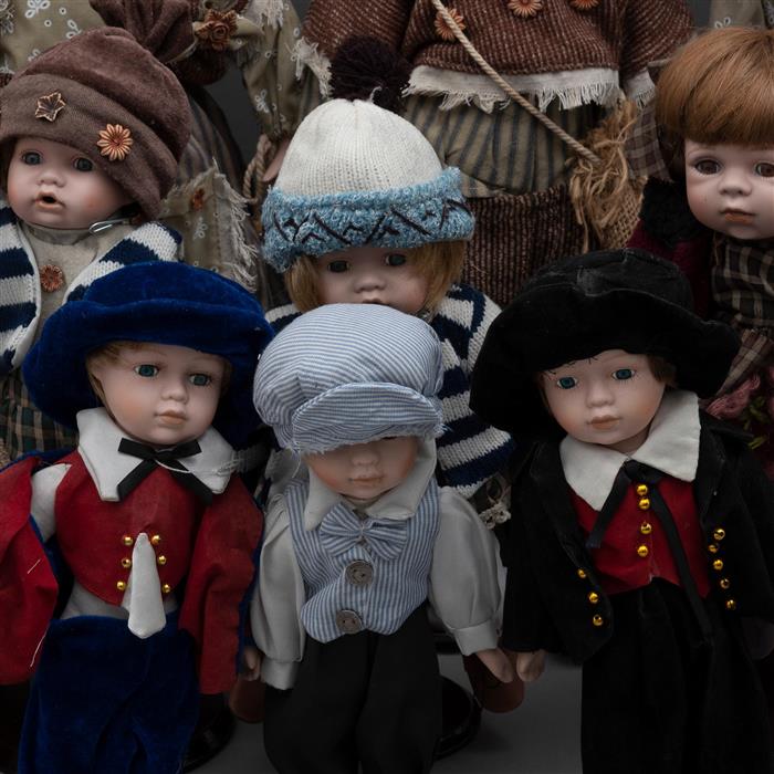 Con indumnetaria, con bases, ojos de vidrio y cabello natural.