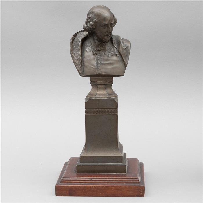 a) BUSTO DE SHAKESPEARE. FRANCIA, CA. 1900. Antimonio. Con base de madera. Detalles de conservación. 30.5 cm de altura