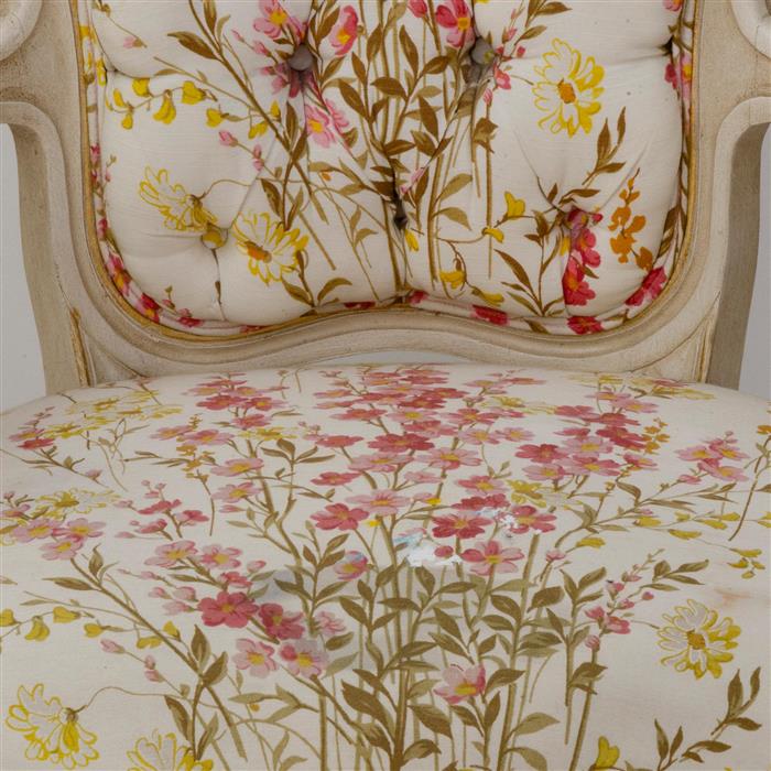 Estructura de madera con tapicería de tela floral, soportes tipo cabriolé.