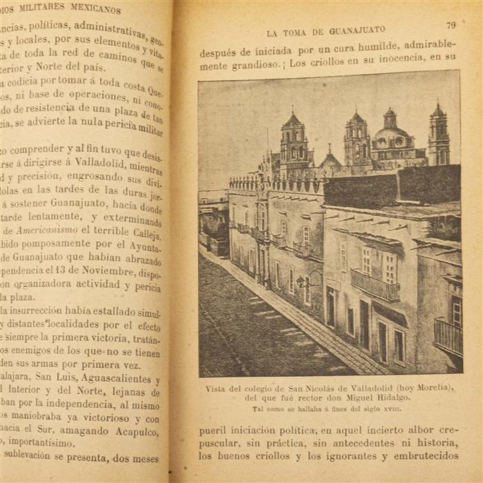 Subasta 1205T, Lote # 118 Libros sobre Historia de México. Títulos: -Frías Heriberto. Episodios Militares Mexicanos. México: Librería de la Vda. de Ch. Bouret, 1901. 289 p. + 1 h.; 277 p. + 1 h. Principales campañas, jornadas, batallas, combates, y actos heroicos que ilustran la historia del Ejército Nacional desde la Independencia hasta el triunfo definitivo de la República. Primera Parte Guerra de Independencia. 13 láminas intercaladas, dos mapas "Carta de la Nueva España, indicando la extensión del territorio donde se propagó la revolución desde 16 de Septiembre de 1810 hasta Marzo de 1811"; "Carta General de la Nueva España según estaba el año de 1813", a doble página. Ejemplar deteriorado, afectado por humedad. Pastas manchadas. Encuadernado en pasta dura. Segunda Parte Invasión Norteamericana. 15 láminas intercaladas. Dos croquis fuera de texto: "Croquis de la Batalla de la Angostura"; "Croquisde la Batalla de Padierna", a doble página, con detalles en color. Pastas nuevas. Encuadernado en pasta dura. Piezas: 2. -Rabasa, Emilio. La Evolución Histórica de México. México: Librería de la Vda. de Ch. Bouret, 1920. 349 p. Cajos quebrados. Pastas gastadas. -Amaya, Juan Gualberto. Venustiano Carranza Caudillo Constitucionalista. México: 1947. 499 p. Cajos quebrados. -Maytorena, José M. Algunas Verdades sobre el General Álvaro Obregón. Imprenta de "El Heraldo de México", 1920. 76 p. Con algunos recortes de periodico, sin lomo. -Mellado, Guillermo. Tres Etapas Políticas de Don Venustiano. Entre otros. Encuadernado en pasta dura y rústica. Total de piezas: 13. Estimado $2,000-2,500