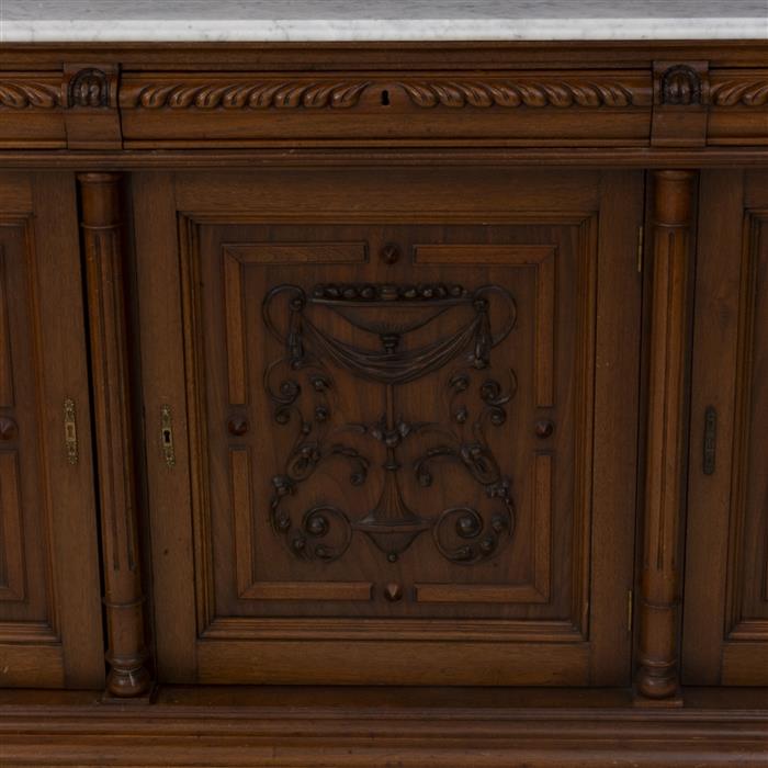 Elaborado a dos cuerpos en madera, con repisa de mármol, y vano con vidrio biselado.