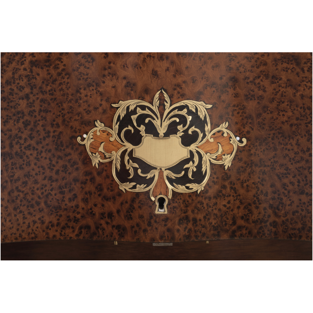 Elaborada en madera enchapada con marquetería y detalles dorados