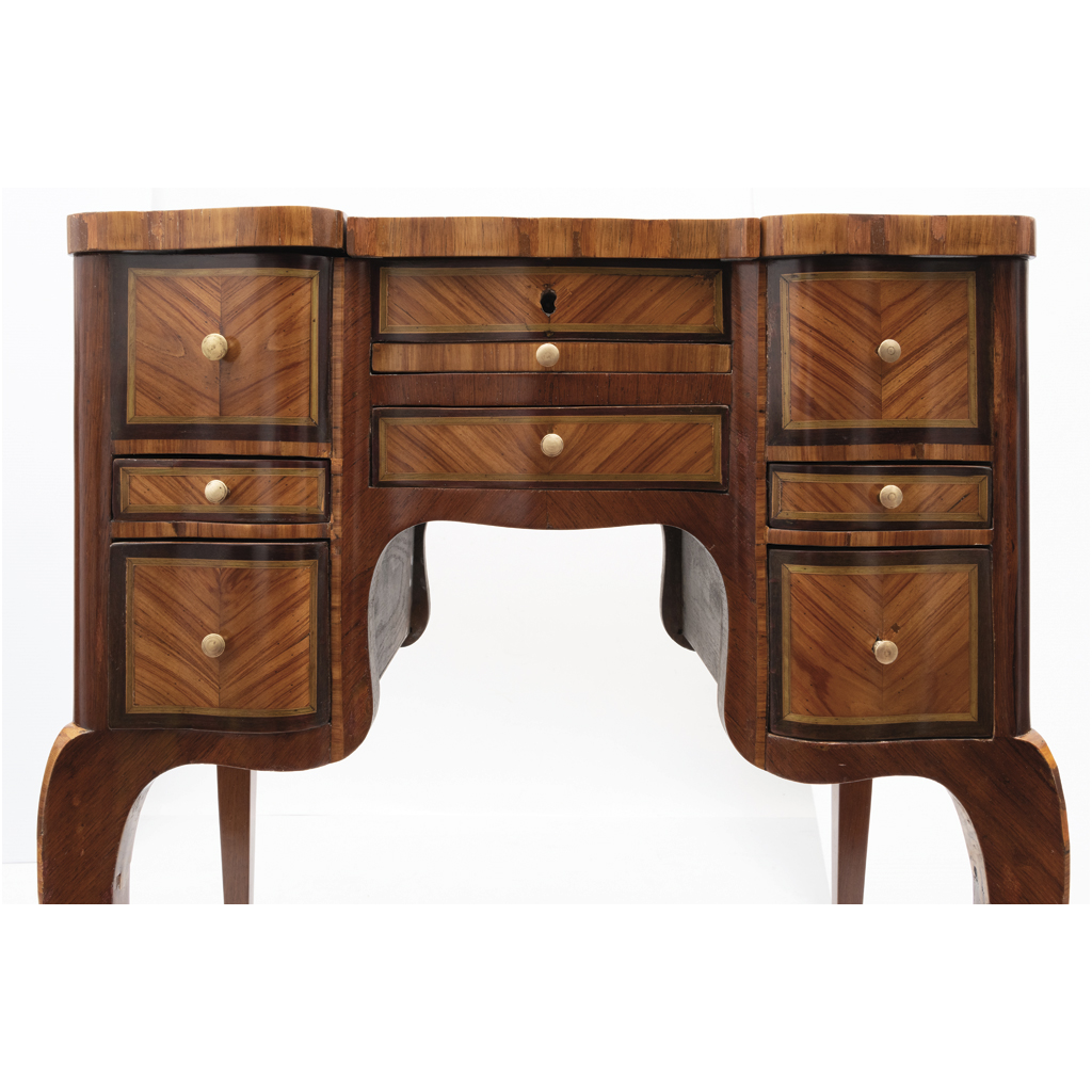 Cuenta con nueve cajones, tapas abatibles a manera de alas, espejo abatible y compartimientos internos