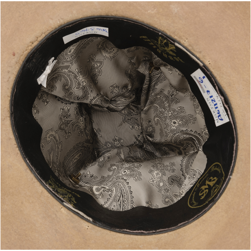 Elaborado en fieltro de pelo de conejo en color arena con toquilla de calabrote y galón bordado en hilo plateado