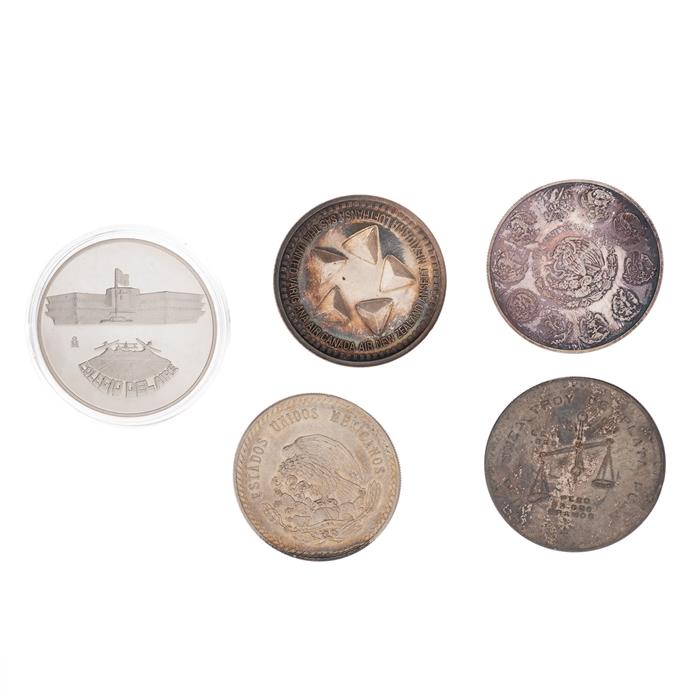Cinco monedas distintos temas y denominaciones y tres anillos en plata .925 y .999.