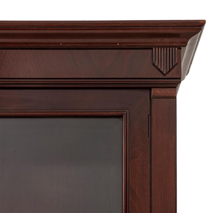 Cuenta con puertas abatibles de vidrio, 5 cajones con tiradores de metal dorado y soportes tipo zócalo