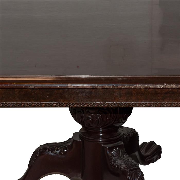 Cuenta con cubierta rectangular y soportes galleados en cabriolé