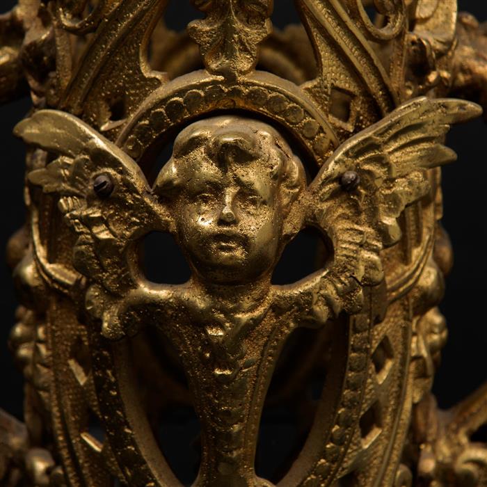 Bronce, acabado dorado; decoración calada y al relieve con diseños a manera de figuras vegetales y querubines