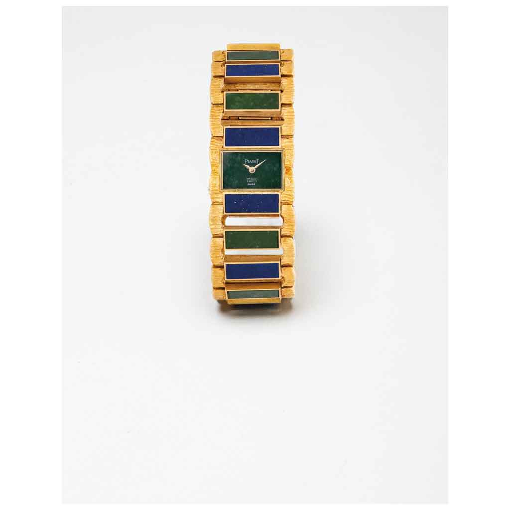 Una colaboración entre PIAGET y VAN CLEEF & ARPELS que crea una joya de época, fusionando alta relojería con artesanía fina. La carátula de un hermoso verde, tiene las palabras "PIAGET", "VAN CLEEF & ARPELS" y "SWISS", sin embargo, algunas de sus letras se encuentran desgastadas. El brazalete tiene engaste de lapislázuli y jadeíta que aumentan su elegancia y belleza. Y a pesar de que algunas piezas se encuentran fracturadas, la combinación del azul profundo del lapislázuli con el oro amarillo crea un contraste sofisticado y atemporal.