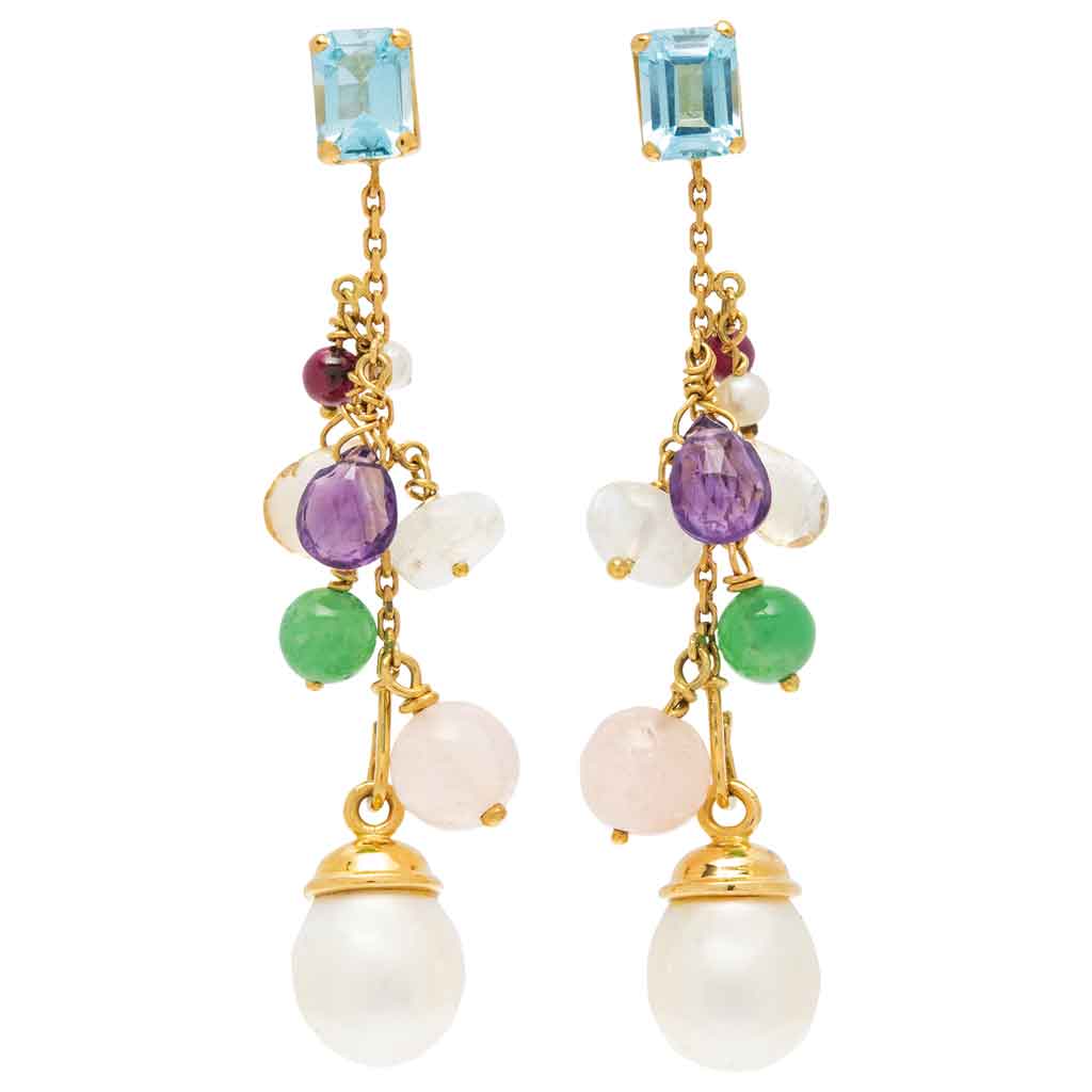 JUEGO DE GARGANTILLA, PAR DE ARETES Y SEIS PENDIENTES CON GRANATES, TOPACIOS, CRISOPRASAS, AMATISTAS, CITRINAS Y PERLAS EN ORO AMARILLO DE 18K