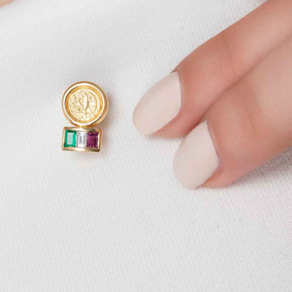 PIN CON ESMERALDA, DIAMANTE Y RUBÍ EN ORO AMARILLO DE 18K