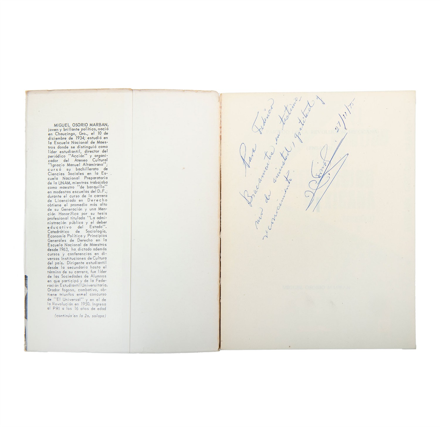 Algunos títulos: Miguel Osorio Marban. El partido de la Revolución Mexicana. México, 1970. Tomos I - II. Dedicado por el autor; Everardo Espino. El Quiebre… México, 2008. Dedicado por el autor; Carlos Loret de Mola Mediz. 29 Artículos Periodísticos. México, 1976. Dedicado por el autor; J. Grey. Por qué Luis Echeverría Debe ser Presidente. México, sin año. Dedicado por el autor; Carlos Cuevas. Sonríe Señor Presidente. México, 1975. Dedicado por el autor;José M. Niño. En torno al Presidente de la República. México, 1974. Dedicado por el autor; Israel visto por Mexicanos; Verdades y Falsedades en el Conflicto Árabe-Israelí; Cinco Años de Política Exterior; Entre otros. Encuadernados en rústica y pasta dura. Total de piezas: 46.