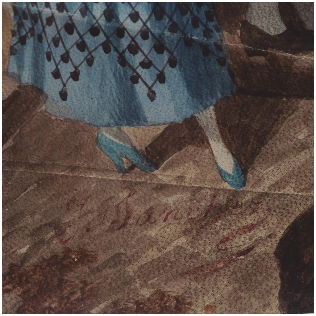 Varillaje de madreperla detallado al oro, y país de papel pintado en acuarela. Firmado: "J. Sánchez".
