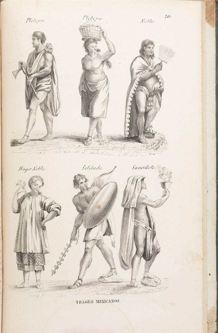 Subasta 902, Lote # 6 AC1518 - Clavigero, Francisco Javier. Historia Antigua de México y de su Conquista. Sacada de los Mejores Historiadores Españoles, y de los Manuscritos y Pinturas de los Indios. Dividida en Diez Libros; Adornada con Mapas y Estampas, e Ilustrada con Disertaciones sobre la Tierra, los Animales y los Habitantes de México. México: Imprenta de Lara, 1844. 4o. marquilla, IX + 285 p. + 1 h.; 319 p. + 3 h. Traducida del italiano por D. Joaquín de Mora. Tomo I: Retrato del autor y 19 láminas. Tomo II: Retrato de Hernán Cortés, cuatro láminas y un plano plegado "Plano del Valle de México". Algunas láminas más cortas y con ligera mancha de humedad en margen inferior, una rasgada en margen inferior. Encuadernado en pasta dura, lomo y puntas en piel. Piezas: 2. Palau: 55481. Estimado $12,000-15,000