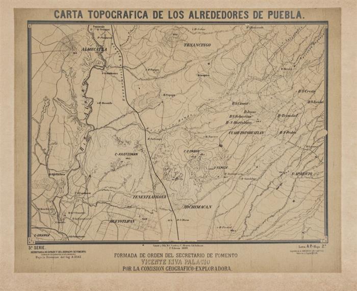 AC1889 - Riva Palacio, Vicente. Carta Topográfica de los Alrededores de Puebla. México, 1889. 16o. marquilla apaisado, 14 h. Compilación fotográfica de las Cartas originales, publicadas en 1883. 14 fotografías, 10 x 12 cm. Cajo y gracia anteriores, quebrados. Encuadernado en pasta dura, en piel. Estimado $6,000-8,000