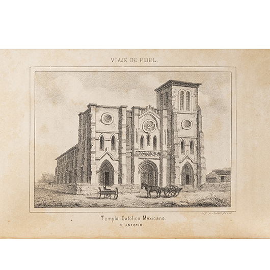Subasta 1004, Lote # 201 Fidel (Guillermo Prieto). Viaje a los Estados Unidos. México: Imprenta del Comercio de Dublán y Chávez, 1877 - 1878. 4o., IX + 625 p. + 1 h.; 593 p. + 3 h.; 532 p. + 2 h. Primera edición. Tomos I - III. Tomo I: Retrato de Guillermo Prieto y diez litografías. Tomo II: Doce litografías. Tomo III: Seis litografías. Litografías por H. Iriarte. Encuadernados en pasta dura, lomo en piel. Piezas: 3. Palau: 237011. Guillermo Prieto visitó las principales ciudades de los Estados Unidos: San Francisco, Nueva Orleans, Nueva York, Filadelfia, Baltimore, Washington. Plasmó anécdotas y observaciones de las costumbres americanas, el viaje causa todavía mayor interés a su paso por los estados que pertenecieron a México: California y Texas. Estimado $11,000-14,000