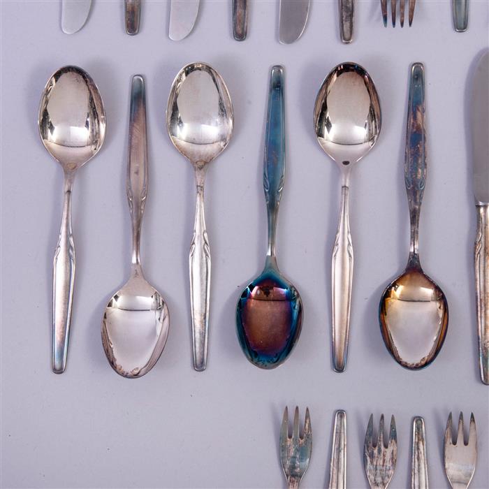 Consta de: 12 cuchillos, 12 tenedores carne, 12 tenedores postre, 12 cucharas soperas, 6 cucharas cafeteras.