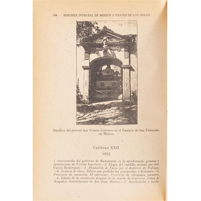 Subasta 1128T, Lote # 197 Torner, Florentino M. Resumen Integral de México a través de los Siglos. México: Compañia General de Ediciones, 1964. Sexta edición. Bajo la dirección de Vicente Riva Palacio. Historia general y completa del desenvolvimiento social, politico, religioso, militar, artistico, cientifico y literario de México desde la antigüedad más remota hasta el establecimiento del gobierno de Júarez en la Ciudad de México. Imparcial y concienzudamente escrita en vista de cuanto existia de notable y en presencia de preciosos datos y documentos hasta entonces desconocidos por los reputados escritores. Tomo I - Primera Época, Historia Antigua por Alfredo Chavero. Tomo II - El Virreinato, Historia de la dominación española en México desde 1521 a 1808 por Vicente Riva Palacio. Tomo III - La Guerra de Independencia por Julio Zarate. Tomo IV - México Independiente 1821 - 1855 por Enrique Olavarria y Ferrari. Tomo V - La Reforma por José. M. Vigil. Ilustrados. Lomos poco gastados. Encuadernados en pasta dura. Piezas: 5. Estimado $1,500-2,000