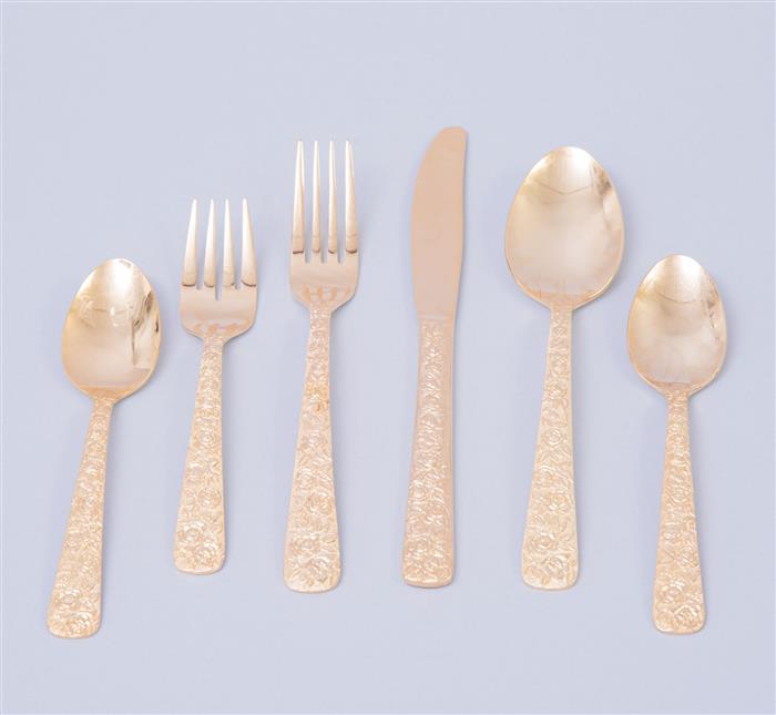 Consta de: 3 charolas de servicio, 6 cubiertos de servicio, cucharas soperas, cucharas de postre, cucharas cafeteras, cuchillos, tenedores de carne y tenedores de ensalada