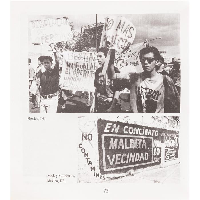 Subasta 1081, Lote # 9 Paredes Pacho, José. Rock Mexicano, Sonidos de la Calle. México: Pesebre - Aguirre y Beltrán Editores, 1992. 8o. marquilla, 144 p. Fotos: Rodolfo Valtierra. Primera edición. Introducción: Carlos Monsiváis. Encuadernado en rústica. Historia del rock mexicano y de los movimientos contraculturales que surgieron en torno a este género musical. José Paredes Pacho, quizás más reconocido por haber sido el baterista del grupo "Maldita Vecindad", traza un recorrido por el ambiente del rock nacional, en busca de la identidad de este género expresado en términos de lo mexicano. Para esto, explora las distintas manifestaciones que conforman la atmósfera de esta cultura: desde festivales, fanáticos y cantantes callejeros, hasta tatuajes, fanzines y vendedores ambulantes de discos compactos. Estimado $3,000-4,000