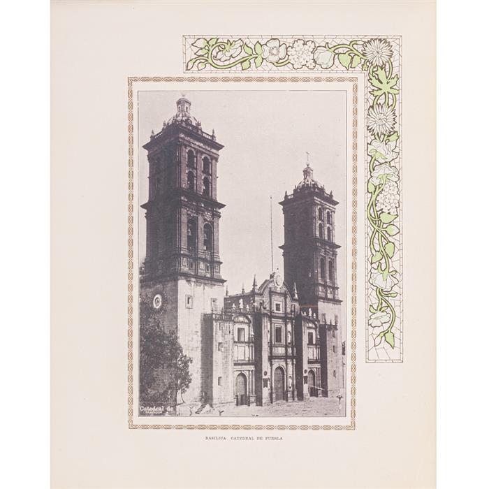 Cardoso, José.Puebla y sus Alrededores en el 1er. Centenario de la Consumación de la Independencia Nacional Mexicana 1821 - 1921. Puebla, octubre 28 de 1921. 4o. marquilla apaisado, 14 h. Retrato de Iturbide, facsimilar de acta de independencia y 103 h. en su mayoría de retratos y vistas de la ciudad. Contiene: Prefacio; Plan de Iguala; breves reseñas sobre la historia, geografía y estadística del estado; Informe de la "Junta Patriótica" y una lista de los gobernantes que ha tenido el Estado de Puebla desde la independencia. Sin portada, hoja de prefacio rasgada. Encuadernación original, pastas semiduras con hierros dorados y retrato de Iturbide y vista de la ciudad de Puebla, ambos con faltantes. Estimado $6,000-8,000
